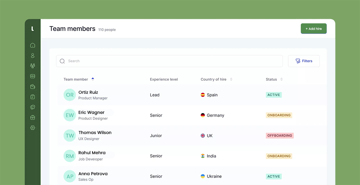 Hire top talent in more than 170 countries and rapidly expand your global team. Retain members of the team even if they relocate.